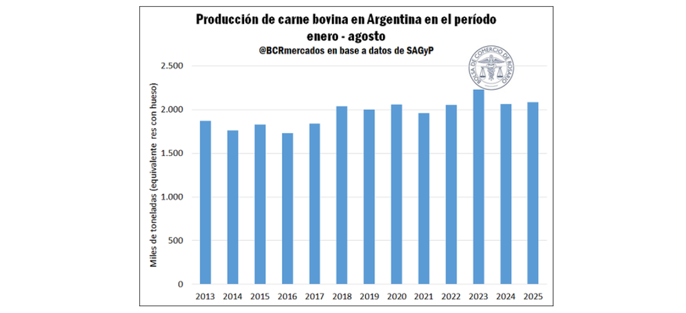 Según la Cámara de la Industria y Comercio de Carnes y Derivados de la República Argentina (CICCRA), la producción de carne bovina entre enero y agosto de 2025 alcanzó casi 2,1 millones de toneladas (equivalente res con hueso), un ligero aumento del 0,5% respecto al promedio de los últimos cinco años. En total, se faenaron 9 millones de cabezas, con un peso promedio de 231 kg por res, lo que marca un incremento de 3 kg con respecto al mismo período del año anterior.