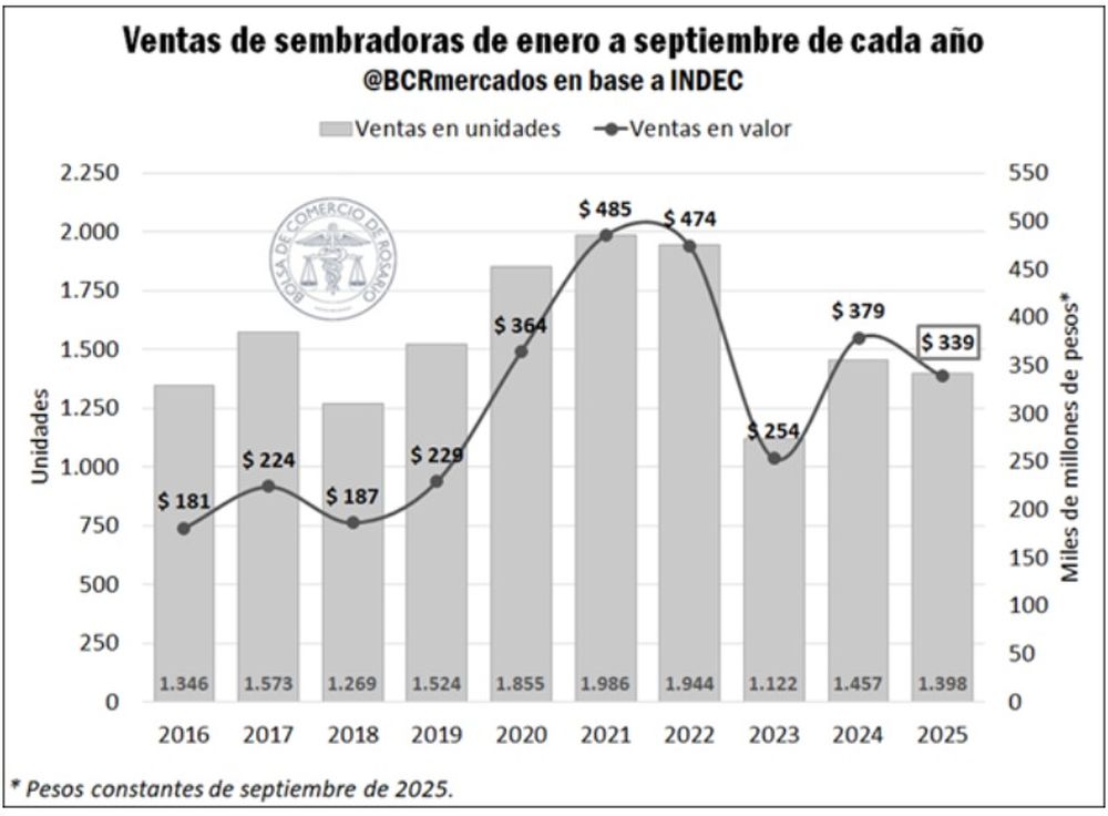 Sembradoras. Ocuparon el tercer lugar, con el 11% de las unidades comercializadas. La cantidad vendida totalizó 1.398 unidades, un retroceso interanual del 4%. Los precios de estas maquinarias se abarataron en términos reales en el último año, de manera que el valor de las ventas, que totalizó $ 339.100 millones entre enero y septiembre, registró una caída del 10% por debajo de 2024.