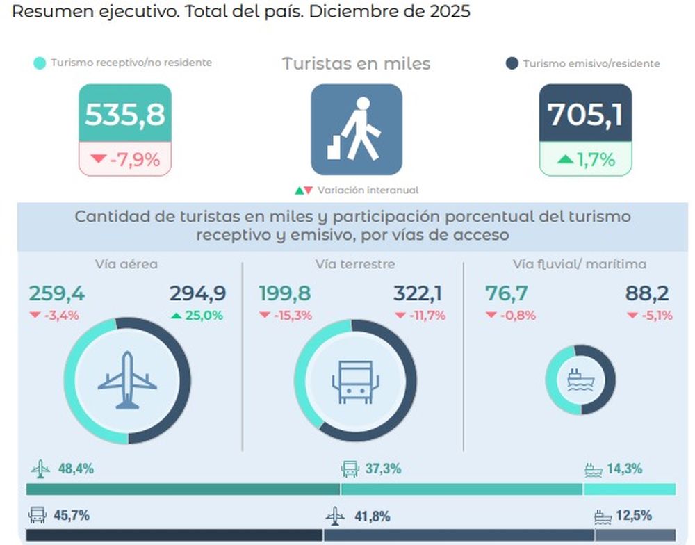 De los 8.775.600 que arribaron al país, 5.315.900 fueron turistas y 3.459.700 excursionistas, y representó un descenso del 19,7% contra los 10.927.600 que llegaron a la Argentina en 2024. Y de los 18.839.900 que salieron durante el año 11.896.300 fueron turistas y 6.942.600 excursionistas, y representó un 38,6% más respecto a los 13.593.000 que emigraron de 2024.