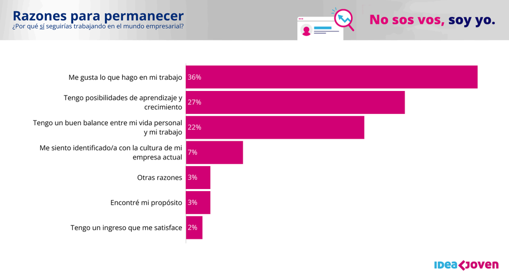 Las razones por las cuales muchos de los encuestados prefieren mantenerse en el mundo empresarial se centran principalmente en el disfrute por lo que hacen en sus trabajos y las posibilidades de crecimiento personal y profesional.