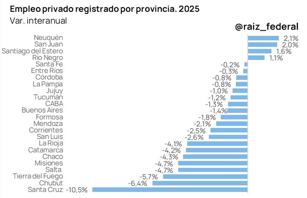 Las caídas más pronunciadas se concentraron en las provincias patagónicas vinculadas a la actividad extractiva. Santa Cruz encabezó el descenso con una pérdida del 10,5% de su empleo privado formal, seguida por Chubut (-6,4%) y Tierra del Fuego (-5,7%). También registraron caídas significativas Salta y Misiones, ambas con -4,7%.