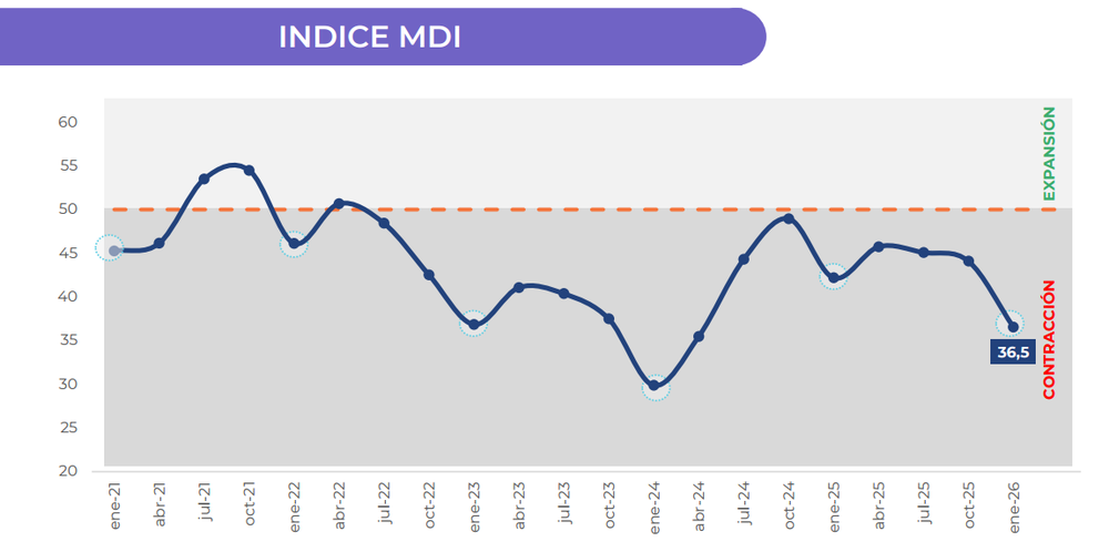 La Unión Industrial Argentina (UIA) difundió esta semana los resultados de su primera encuesta trimestral de 2026, que muestra un deterioro generalizado en los principales indicadores del sector manufacturero. El Monitor de Desempeño Industrial (MDI), el índice que elabora el Centro de Estudios de la central fabril (CEU-UIA) para anticipar la evolución de la actividad, se ubicó en 36,5 puntos en enero, su segundo valor más bajo para ese mes en toda la historia de la serie y el decimoquinto relevamiento consecutivo por debajo del umbral de expansión, fijado en 50 puntos. Frente al relevamiento de octubre de 2025, el índice retrocedió 7,5 puntos; en la comparación con enero de 2025, la caída fue de 5,6 puntos. El relevamiento se realizó entre el 2 y el 16 de febrero sobre una muestra de 644 empresas industriales de distintos sectores, tamaños y regiones, elaborado en conjunto con ADIMRA y FISFE.