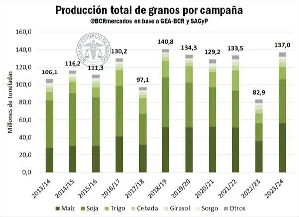 En este sentido, desde la Bolsa de Rosario aseguran: "La recuperación de la producción no solo tiene un impacto en el frente externo, generando divisas genuinas para el país, sino que también incide en la economía nacional: el Valor Agregado Bruto de la producción de granos en la nueva campaña se triplica respecto del valor del ciclo 2022/23, alcanzando más de US$ 15.000 millones".