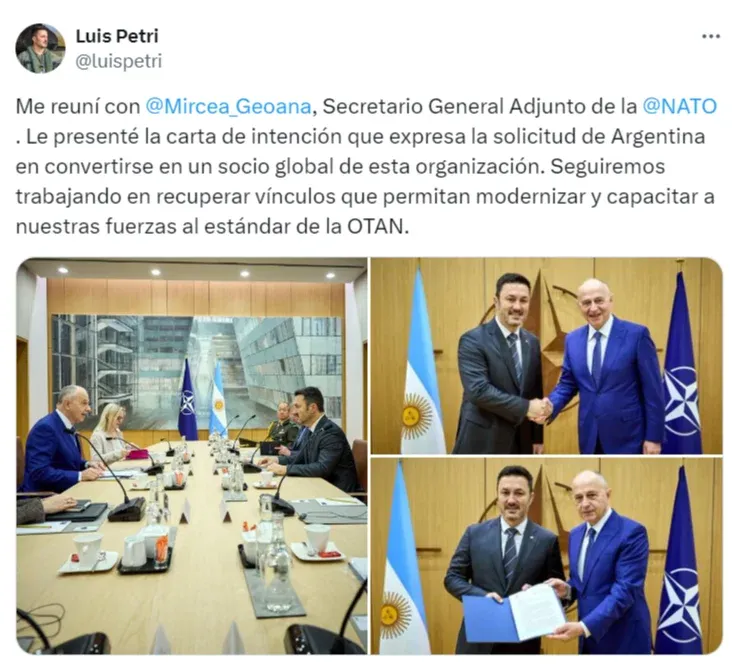 El ministro de Defensa argentino, Luis Petri, reveló que durante una reunión con el secretario general adjunto de la OTAN, Mircea Geoana, el país formalizó su solicitud para ser reconocido como "socio global" de la organización. Petri enfatizó el compromiso argentino de fortalecer la cooperación con la OTAN para modernizar y capacitar a sus fuerzas armadas conforme a los estándares de la alianza.