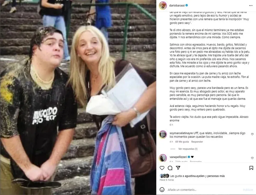 “Te di otro abrazo, sin que el mismo terminara ya me estabas poniendo la remera encima de mi camisa. Vos SOS esto me dijiste. Y nos entendimos con una mirada. Como siempre”, recordó sobre ese momento de su juventud. “Salimos con otros egresados. Huevos, bardo, gritos, felicidad y descontrol. Antes de irnos para el departamento me dijiste de sacarnos una foto pero que ni en pedo me abrazabas porque habías ido a la pelu. Yo te abrace igual y te dejaste. Me trajiste una toalla del año del orto que según vos era mi preferida cuando era chico. Nos sacamos esta foto. Me miraste a los ojos y me dijiste ´te amo gordito, vaya y disfrute´. Me acuerdo como si estuviera pasando ahora”, continuó, cada vez más conmovido en su relato.