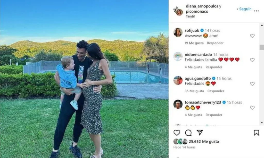 Juan "Pico" Mónaco y su esposa, Diana Arnopoulos, compartieron la emocionante noticia de su segundo embarazo en redes sociales. En una publicación íntima, mostraron a Noah, su primer hijo, junto al mensaje "Bendecidos con otro angelito en camino". La tierna imagen, tomada en Tandil, cautivó a seguidores.