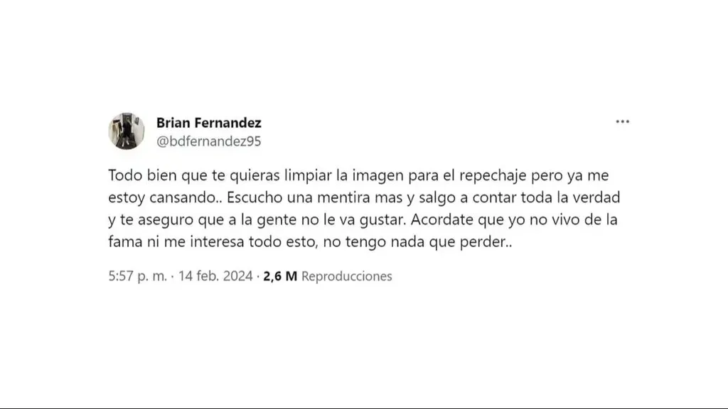 Estas declaraciones provocaron una respuesta airada de Brian, quien decidió romper su silencio a través de su cuenta en la plataforma X (ex Twitter). En su mensaje, manifestó “Todo bien que te quieras limpiar la imagen para el repechaje, pero ya me estoy cansando. Escucho una mentira más y salgo a contar toda la verdad. Te aseguro que a la gente no le va a gustar. Acordate que yo no vivo de la fama ni me interesa todo esto, no tengo nada que perder”.