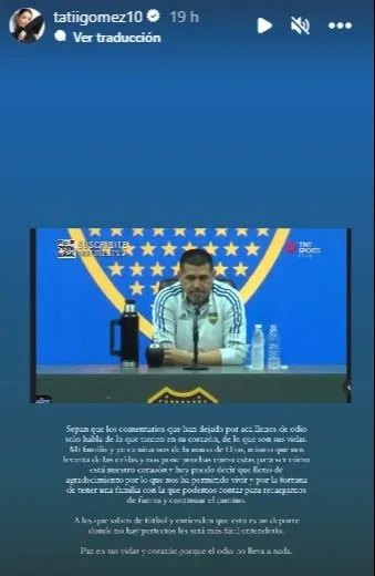 En una publicación en sus historias, Tatiana reposteó un segmento de la conferencia de prensa de Juan Román Riquelme, en la que se hacía mención al difícil momento personal que atraviesa Fabra luego de la final perdida en el estadio Maracaná de Río de Janeiro. En su mensaje, Tatiana aseguró que tanto ella como su esposo se fortalecerán tras esta experiencia.