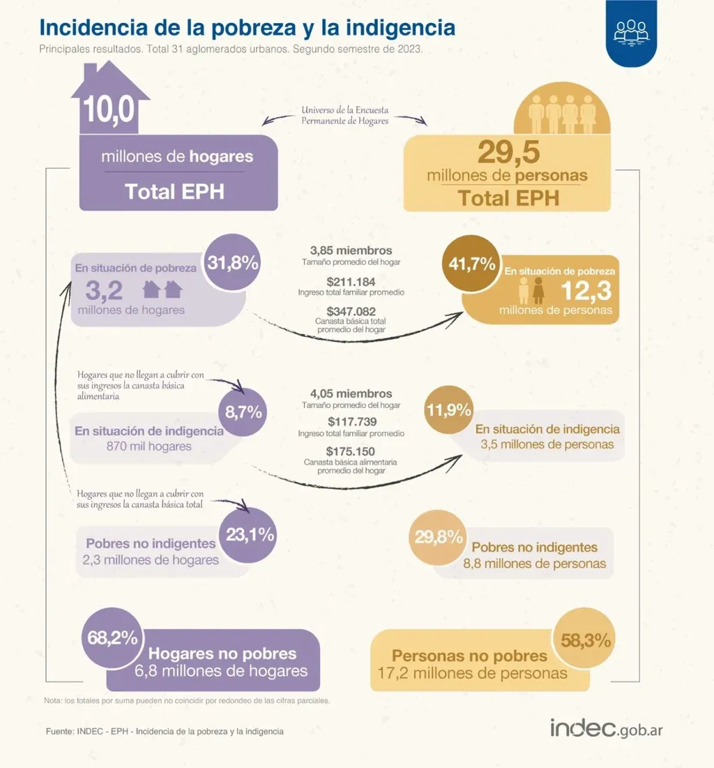 Según el INDEC, este aumento se traduce en 3.193.297 hogares y 12.300.481 personas por debajo de la línea de pobreza, y 869.821 hogares y 3.520.174 personas en situación de indigencia en los 31 aglomerados urbanos encuestados.