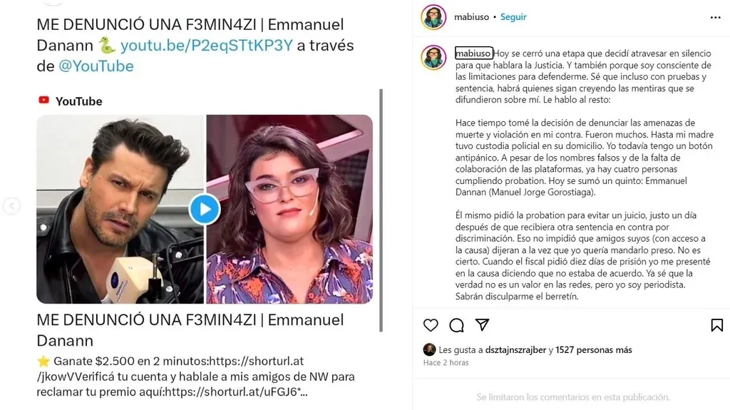 Tras conocer la sentencia, Abiuso compartió un mensaje en sus redes sociales: “Hoy se cerró una etapa que decidí atravesar en silencio para que hablara la Justicia. Y también porque soy consciente de las limitaciones para defenderme. Sé que incluso con pruebas y sentencia, habrá quienes sigan creyendo las mentiras que se difundieron sobre mí”.