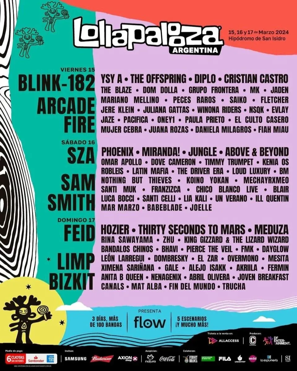Este martes, la productora DF Entertainment habilitó la venta de pases diarios para el Lollapalooza Argentina 2024, con confirmados como Limp Bizkit, SZA, Sam Smith, Arcade Fire, Blink-182 y Feid, entre otros. Las entradas, disponibles para el 15, 16 y 17 de marzo en el Hipódromo de San Isidro, se consiguen desde $50.000 durante la Preventa 1 en la web de AllAccess, con opciones de pago en cuotas con tarjeta Santander American Express.