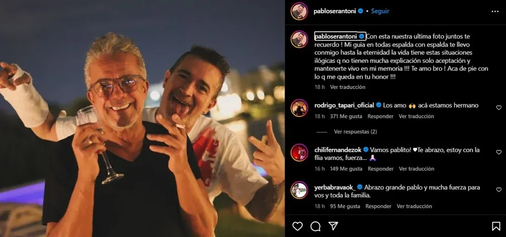La publicación concluye con una expresión de amor fraternal y una muestra de fortaleza en medio del dolor: "¡Te amo bro! ¡¡Acá de pie con lo que me queda en tu honor!!". Estas palabras no solo reflejan el vínculo especial entre los hermanos Serantoni, sino también el impacto emocional que la partida de Adrián ha tenido en Pablo, quien busca honrar su memoria y mantener vivo su legado.