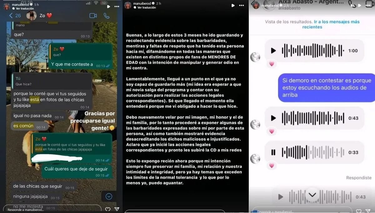 Manuel Ibero, pareja de Zoe Bogach de Gran Hermano, hizo una fuerte declaración en sus redes sociales luego de la filtración de controvertidos audios de su suegra, Aixa Abasto, en su contra. La madre de Zoe reveló su preocupación personal por la posibilidad de que su hija se mude sola o con su novio.