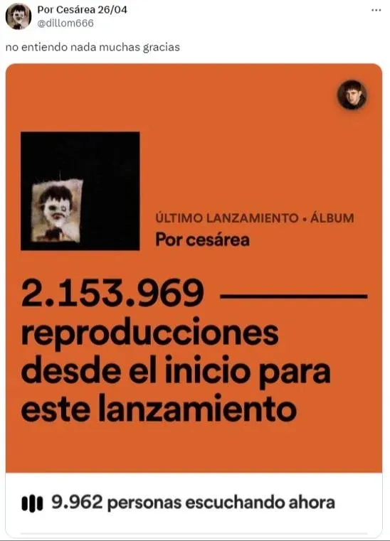 Dillom twitteó su desconcierto a las 00:25 de esta madrugada luego de lanzar su segundo disco: “No entiendo nada, muchas gracias”. Este mensaje llegó apenas 25 minutos después de lanzar al mundo su esperado segundo álbum de estudio, "Por Cesárea", el cual ya había cosechado más de dos millones de reproducciones en Spotify desde su debut.