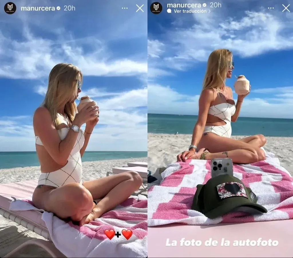 De esta manera, Manu fotografió a su esposa luciendo un traje de baño enterizo y tomando mate en una reposera a orilla de mar y de perfil. También le agregó dos corazones, en clara señal al bebé en camino.