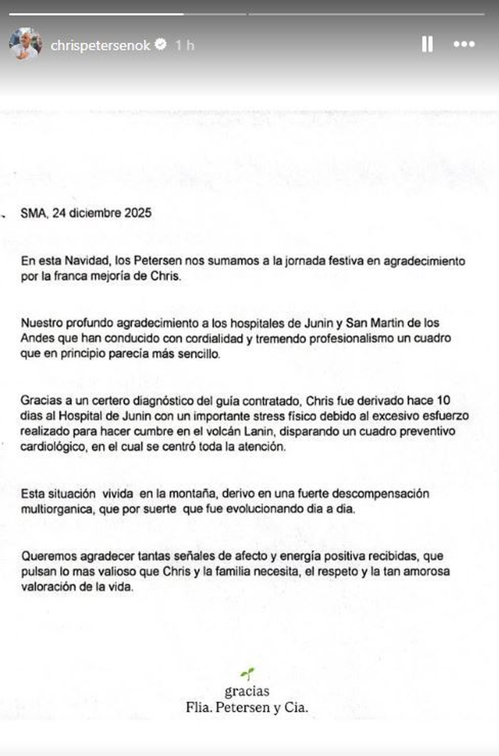 A casi tres semanas de que el chef y empresario Christian Petersen sufriera un cuadro de insuficiencia cardíaca mientras escalaba en grupo el volcán Lanin de Neuquén, su familia rompió el silencio y publicó un comunicado.