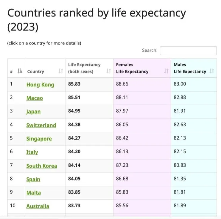 El país con más esperanza de vida es Hong Kong con un global de 85.3 años. ¡Las mujeres hongkonesas tienen una esperanza de casi 90 años!