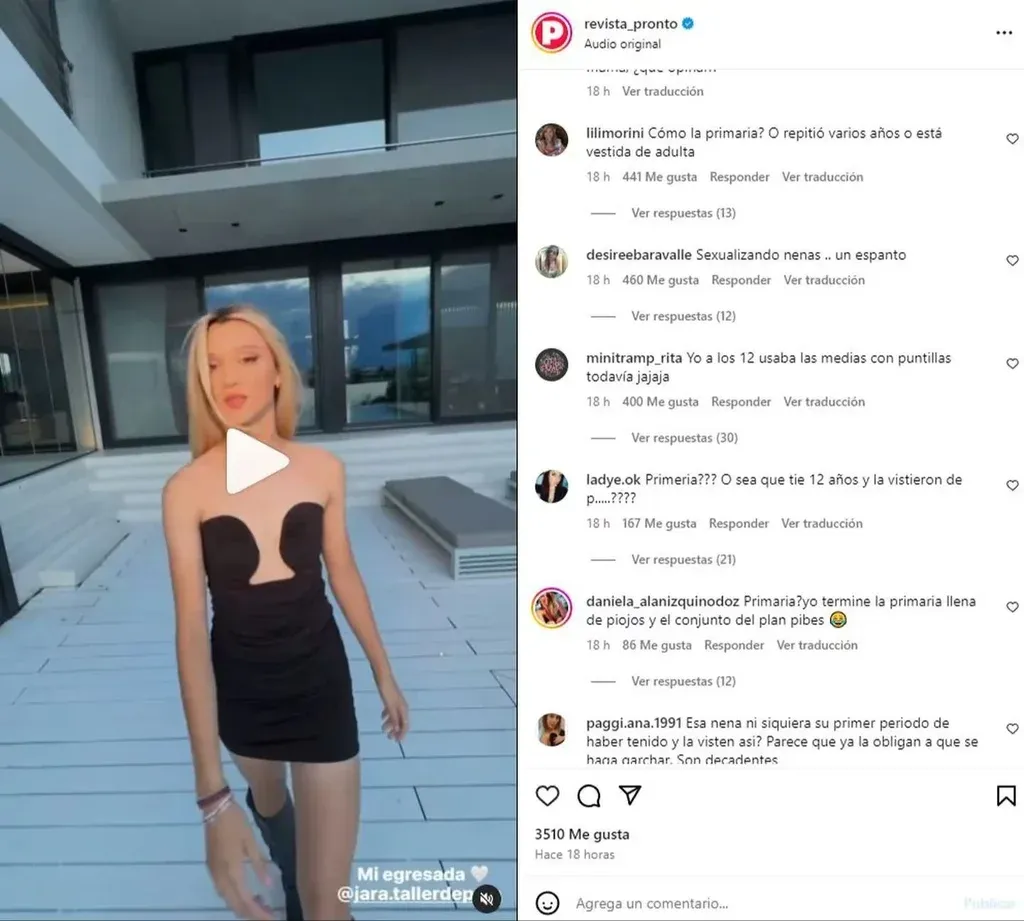 "Sexualizando a las niñas, un espanto", "¿Cómo en la primaria? ¿Repetirá varios años o la vistieron de adulta?", "Si la visten así ahora, ¿qué quedará para el secundario?", "Mi hija está en segundo año y no se viste así. Esto es un exceso", "No lo puedo creer. Al terminar la facultad va a salir desnuda", "Nuestros niños y niñas están quemando etapas. Cuidemos la infancia. La niña es divina, pero es eso, una niña. Ese vestido le quedará igual o más hermoso cuando sea la edad apropiada", fueron algunas de las opiniones expresadas.