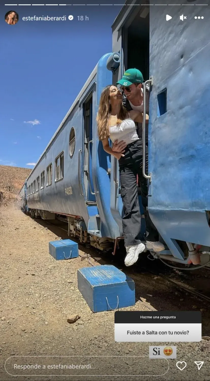 La panelista de los programas Poco Correctos y Mañanísima compartió una foto con su pareja durante su viaje por Salta, al responder una pregunta de sus seguidores. La imagen muestra a la pareja abrazada en un tren, mirándose con ternura.