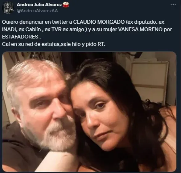 Y añadió: ”Dije que no (soy pobre) y justo a mi hermano se le rompió su computadora. (...) Las Mac llegaban en una semana, pero eso no pasa. Hasta ahí era normal dado el momento del año, político, etc.... Ella me ofrece, para compensar la tardanza otra Mac a 500 dólares, y yo sospecho, pero ella me alienta y no daba dudar de ‘la mujer de Morgado’. Viene fin de año y ellos se van a Brasil... Y yo ahí ya me sentía una boluda, pero me daba vergüenza reconocer lo que pasaba. Enero fue una demencia de verso y ya en febrero le pido la plata y empieza otro capítulo”.