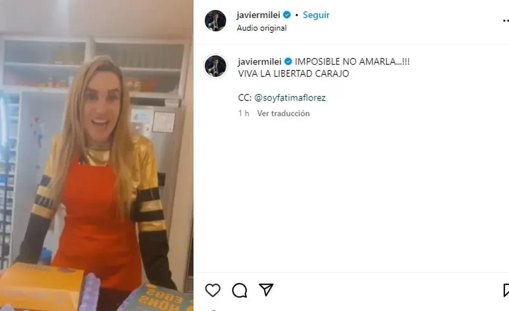 Milei redobló la apuesta y publicó el video en su feed y en sus historias. Al lado del clip, le dejó un tierno y elocuente mensaje a su flamante pareja. “¡Imposible no amarla!! Viva la libertad carajo”, escribió.