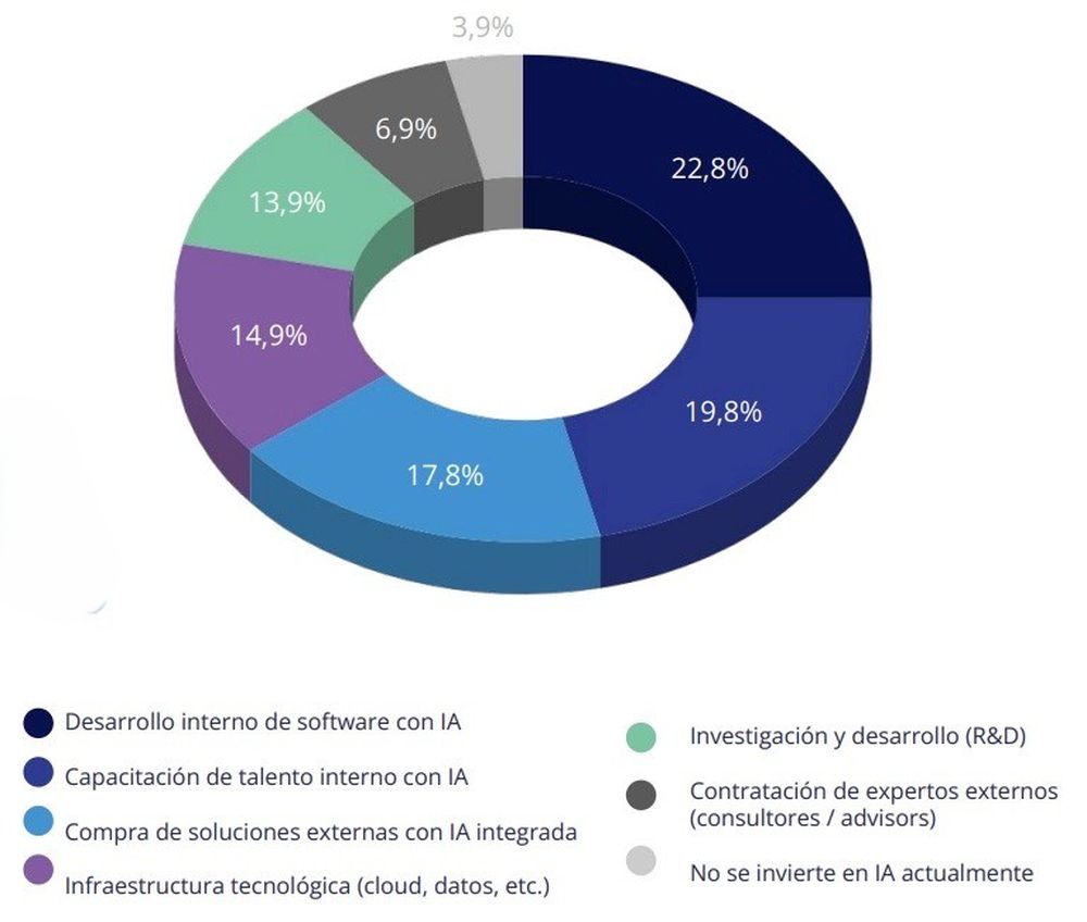 Mientras que el 33% está utilizando recursos externos, ya sea en compra de soluciones externas o en contratación de expertos externos, el 57% de las empresas están gestionando de manera interna sus iniciativas en IA, ya sea en desarrollos internos de software con IA, como en la capacitación de talento interno en IA y en Investigación y Desarrollo.