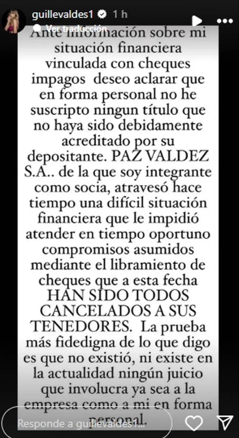 Tras la difusión de esta información por diversos medios, Guillermina decidió hacer un descargo a través de sus historias en Instagram, donde buscó aclarar la situación. "Ante información sobre mi situación financiera vinculada con cheques impagos, deseo aclarar que en forma personal no he suscripto ningún título que no haya sido debidamente acreditado por su depositante", afirmó.