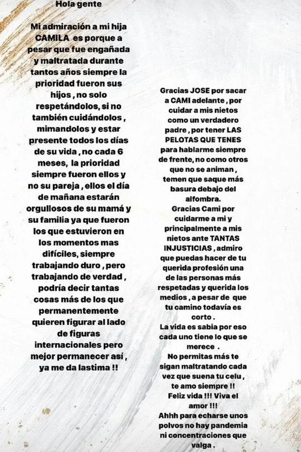 A través de una historia en Instagram, lanzó frases contundentes que parecían dirigidas a su ex yerno. "Mi admiración a mi hija Camila es porque a pesar de que fue engañada y maltratada durante tantos años, siempre la prioridad fueron sus hijos, no solo respetándolos, sino también cuidándolos, mimándolos y estando presente todos los días de su vida, no cada 6 meses. La prioridad siempre fueron ellos y no su pareja", escribió.