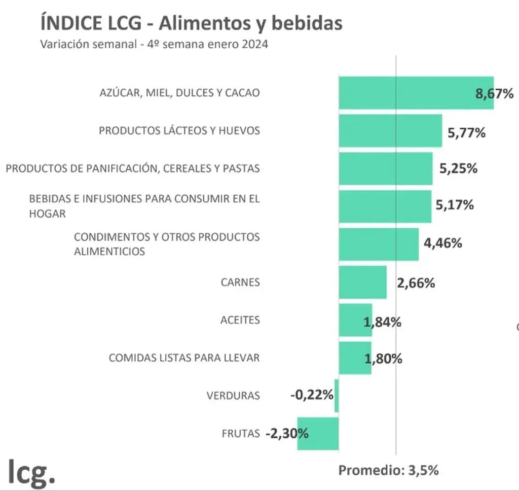 LCG informa que los alimentos registraron una inflación promedio del 23,1% en las últimas cuatro semanas, mientras que los demás productos de la canasta básica aumentaron un 14,6% en el mismo periodo.