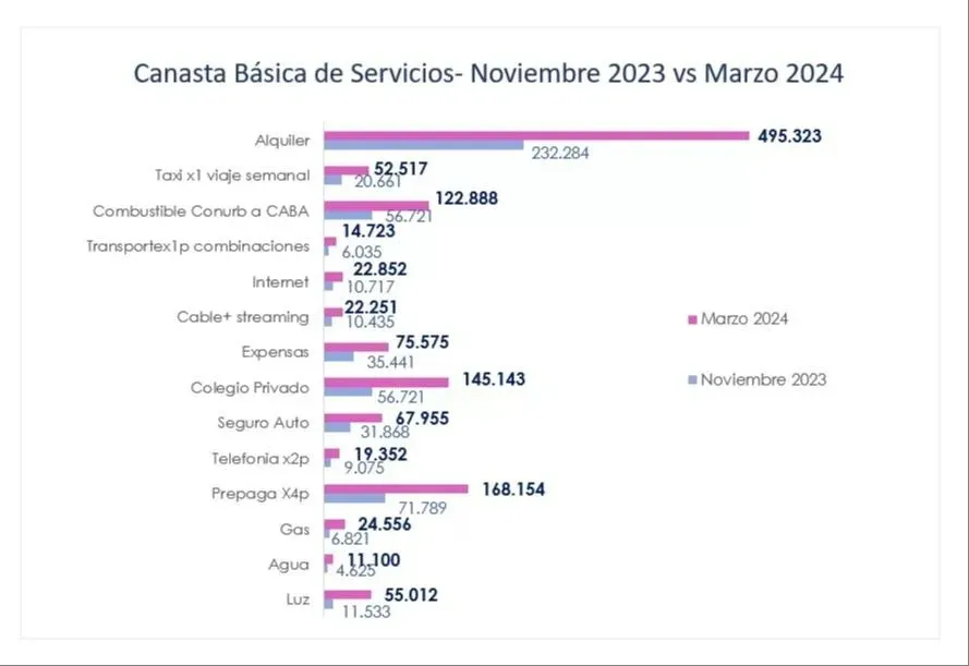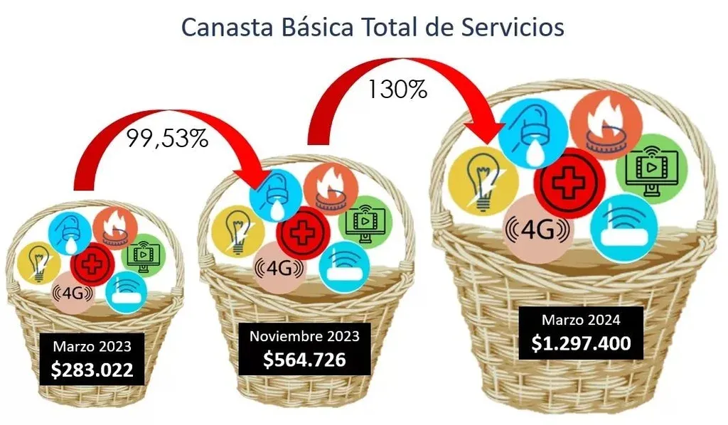 Esto sin contar la canasta de consumo masivo para esa misma familia que se estima para marzo de 2024 en $420.000, incluyendo alimentos, bebidas, artículos de limpieza y cuidado personal. Es decir que una familia tipo de clase media necesitaría $1.717.400 para sostener su nivel de vida y calidad de servicios al iniciar el tercer mes del año 2024.