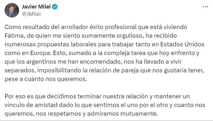De esta manera, Milei concluyó su mensaje confirmando la separación de la comediante. "Por eso es que decidimos terminar nuestra relación y mantener un vínculo de amistad dado lo que sentimos el uno por el otro y cuanto nos queremos, nos respetamos y admiramos mutuamente", anunció.