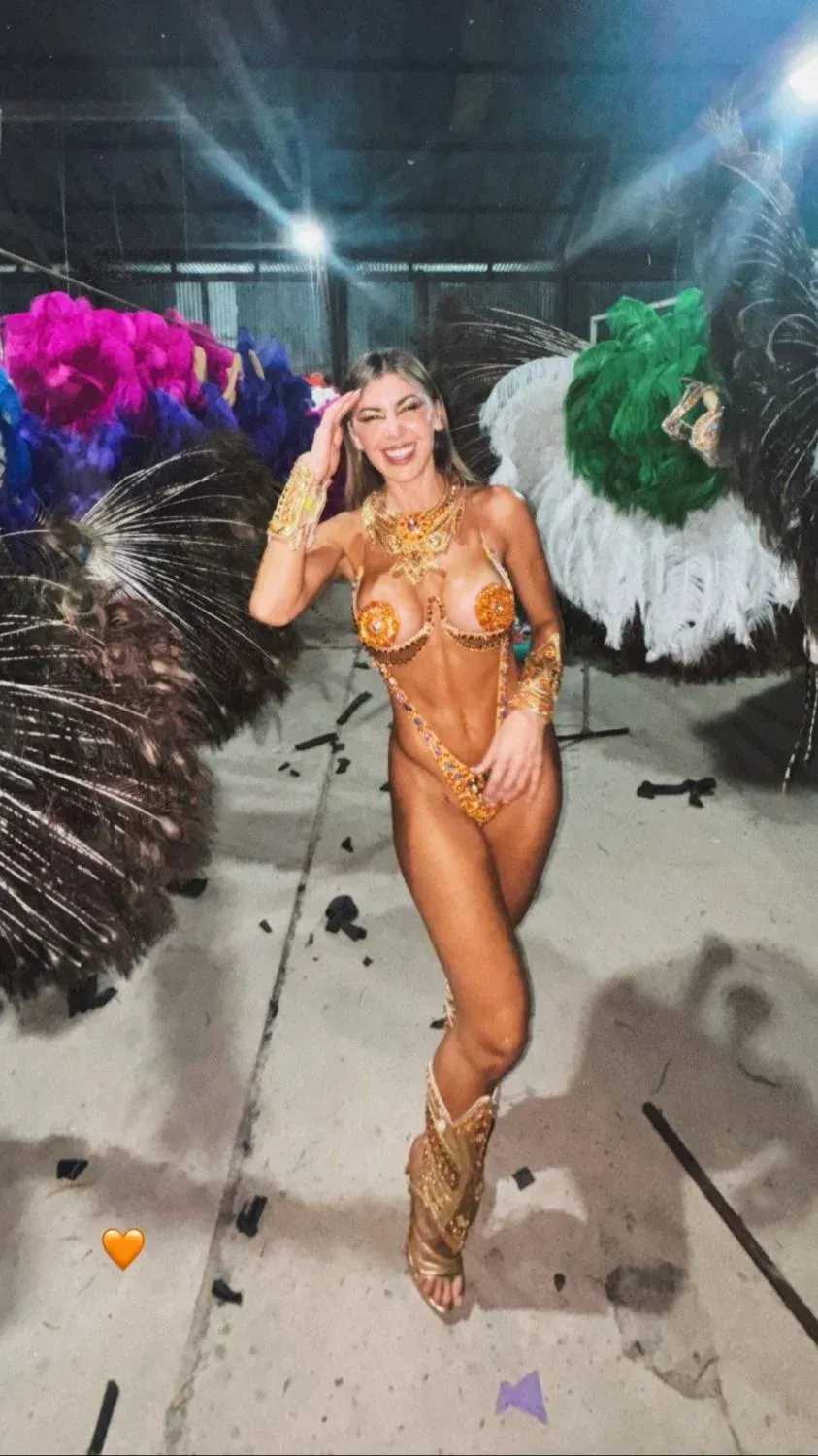 Muri lució un traje adornado con frondosas plumas celestes y blancas, en un gesto hacia su pareja y a "la Scaloneta". Este año repitió la elección de colores albicelestes para su disfraz, un guiño similar al realizado el año anterior.