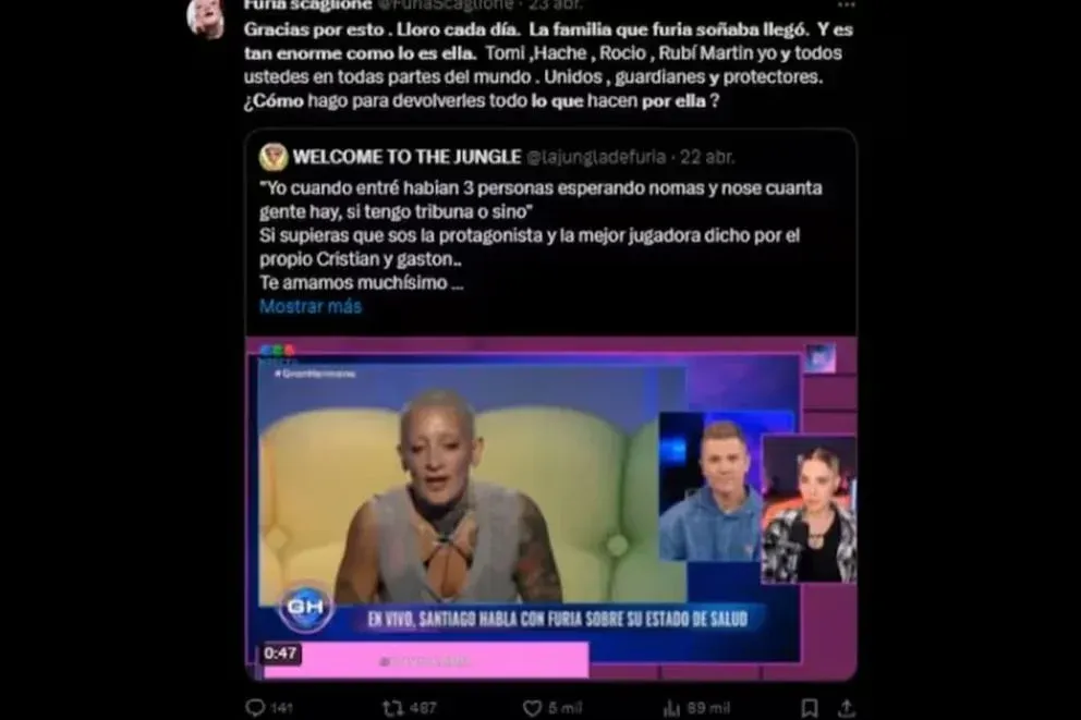 “Gracias por esto. Lloro cada día. La familia que Furia soñaba llegó. Y es tan enorme como lo es ella. Tomi, Hache, Rocío, Rubí Martin, yo y todos ustedes en todas partes del mundo. Unidos, guardianes y protectores. ¿Cómo hago para devolverles todo lo que hacen por ella?”, posteó en X.