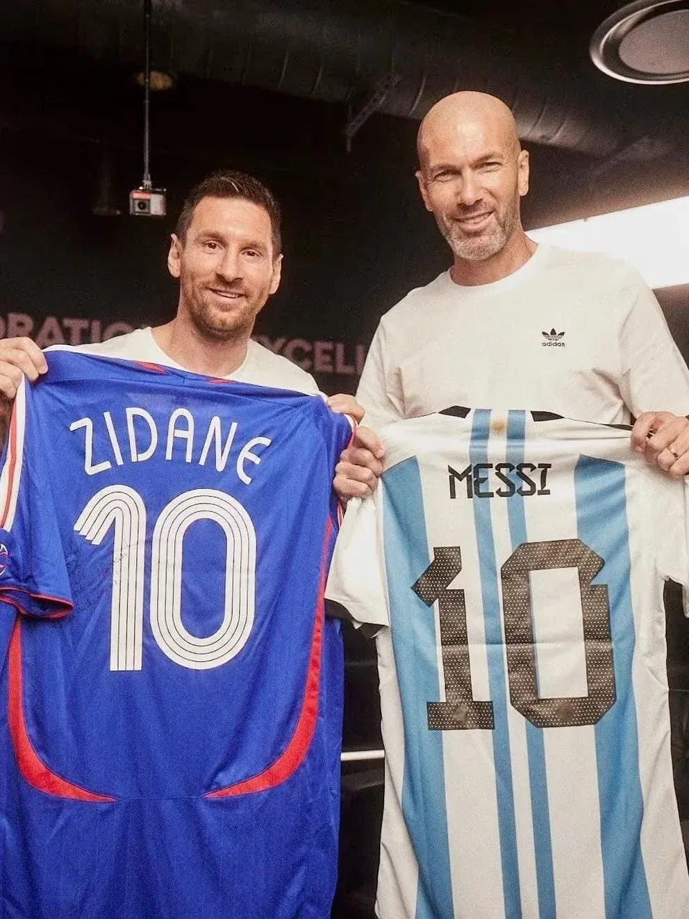 Messi y Zidane posando con camisetas de Argentina y Francia.