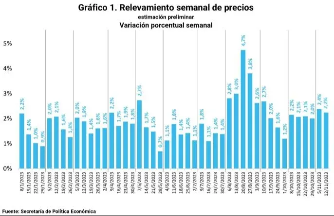 En el informe oficial correspondiente al periodo del 6/11/2023 al 12/11/2023, el relevamiento semanal realizado por la Secretaría indica que los precios al por menor habrían experimentado un aumento del 2,2%. "Destacan, en relación con el promedio (2,2%), los incrementos en Alimentos y Bebidas de Almacén (3,4%), Frutas (3,3%), Carnes (2,8%) y Regulados (2,9%). Por otro lado, se observan aumentos por debajo del promedio en Indumentaria (1,4%) y Verduras (2,1%)", agrega el informe.