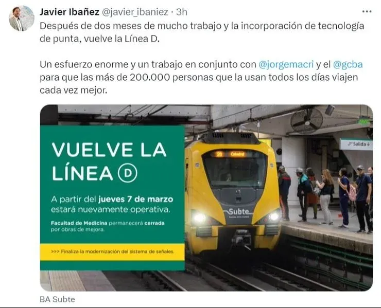 "MAÑANA VUELVE A FUNCIONAR LA LÍNEA D DEL SUBTE", anunció Macri en su cuenta de X (ex Twitter). Añadió que "agilizamos los trabajos de modernización y logramos adelantar la reapertura de la LÍNEA D, que ahora contará con mejores estándares de seguridad y mayor frecuencia del servicio". La reapertura estaba originalmente programada para el domingo 17 de marzo.