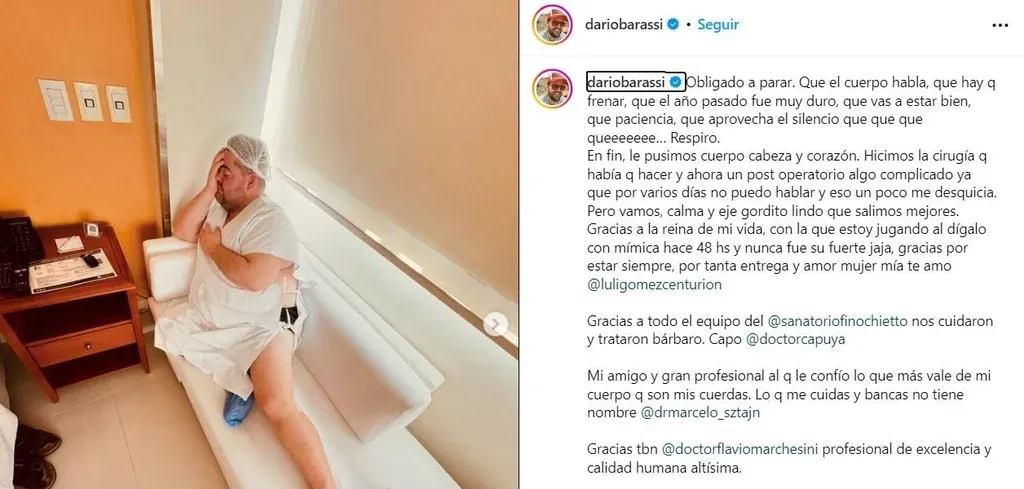 Aunque el camino hacia la recuperación se presenta desafiante, Barassi ya ha dado el primer paso y ha recibido el alta médica. Desde su hogar, compartió una serie de imágenes que capturaron sus reflexiones durante su estadía en el Sanatorio Finochietto, donde, con su característico tono irónico y relajado, compartió su perspectiva sobre esta experiencia: "Obligado a parar. Que el cuerpo habla, que hay que frenar... Respiro".