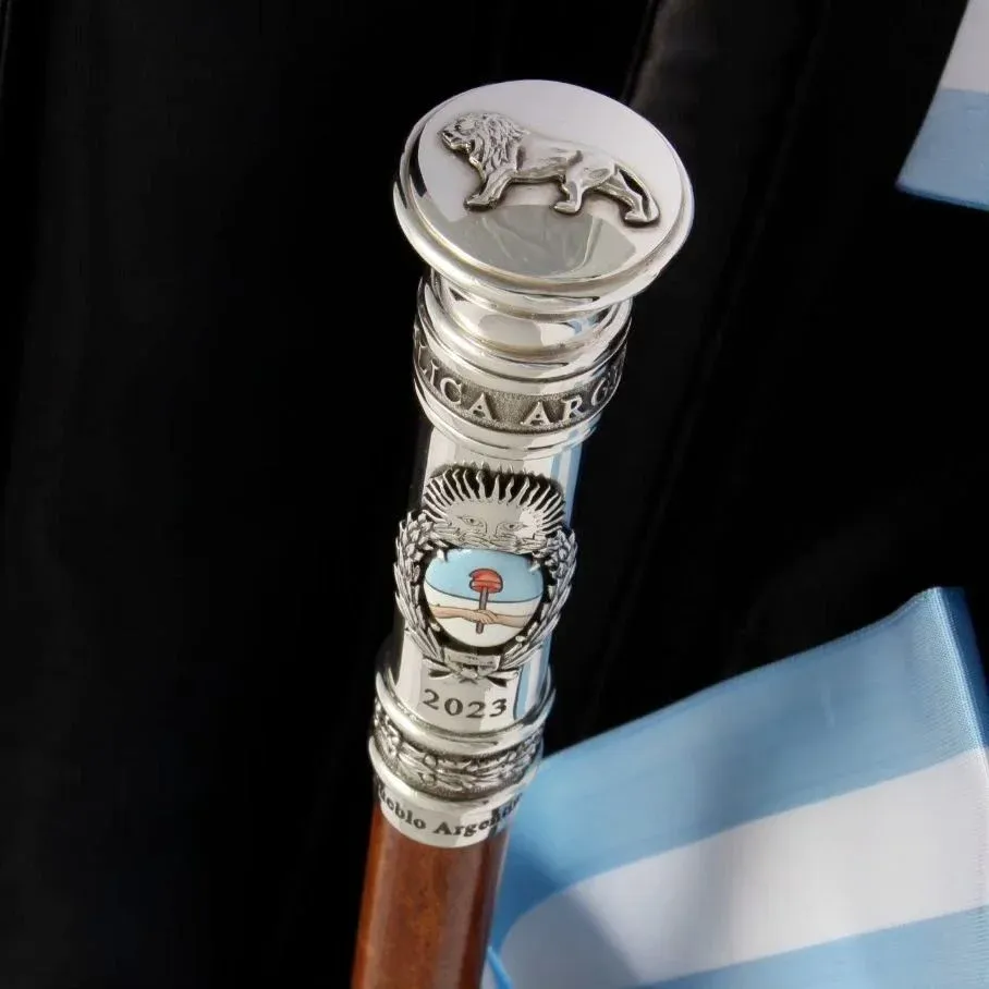 Con una altura de 98 centímetros, el bastón está confeccionado en plata y fresno teñido, mientras que el escudo es de esmalte a fuego vitrificado. Cabe resaltar que la figura del felino, que adorna la parte superior, solo podrá ser apreciada por Milei, ya que, en su uso cotidiano, solo se visualizan el escudo argentino y los laureles.