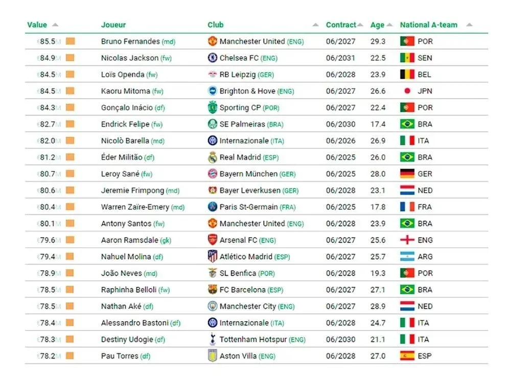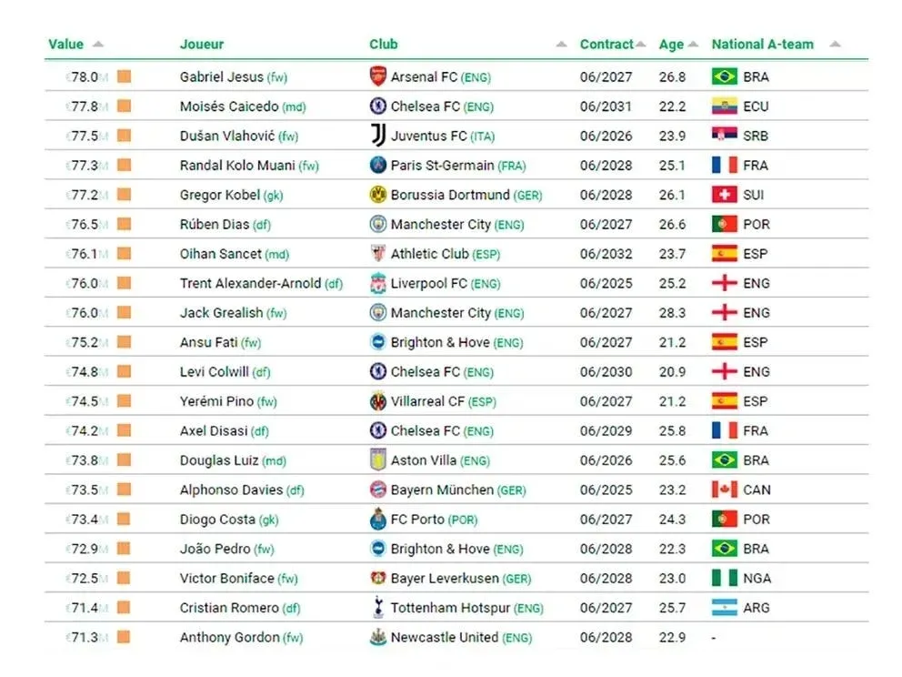 Siete argentinos figuran en la lista, con solo uno en el Top 10: Julián Álvarez, estrella del Manchester City, ocupa la octava posición con un valor de 164,7 millones de euros (USD 180,3 millones). Le siguen Enzo Fernández en el puesto 17° con 123,6 millones de euros (USD 135,3 millones), Alexis Mac Allister en el puesto 18° con 105,1 millones de euros (USD 115 millones) y Lautaro Martínez en el puesto 33° con 102,9 millones de euros (USD 112,6 millones). Más abajo en la lista se encuentran Alejandro Garnacho en el puesto 59° con 94,5 millones de euros (USD 103,4 millones), Nahuel Molina en el puesto 84° con 79,4 millones de euros (USD 86,9 millones) y Cristian Cuti Romero en el puesto 99° con 71,4 millones de euros (USD 78,1 millones).