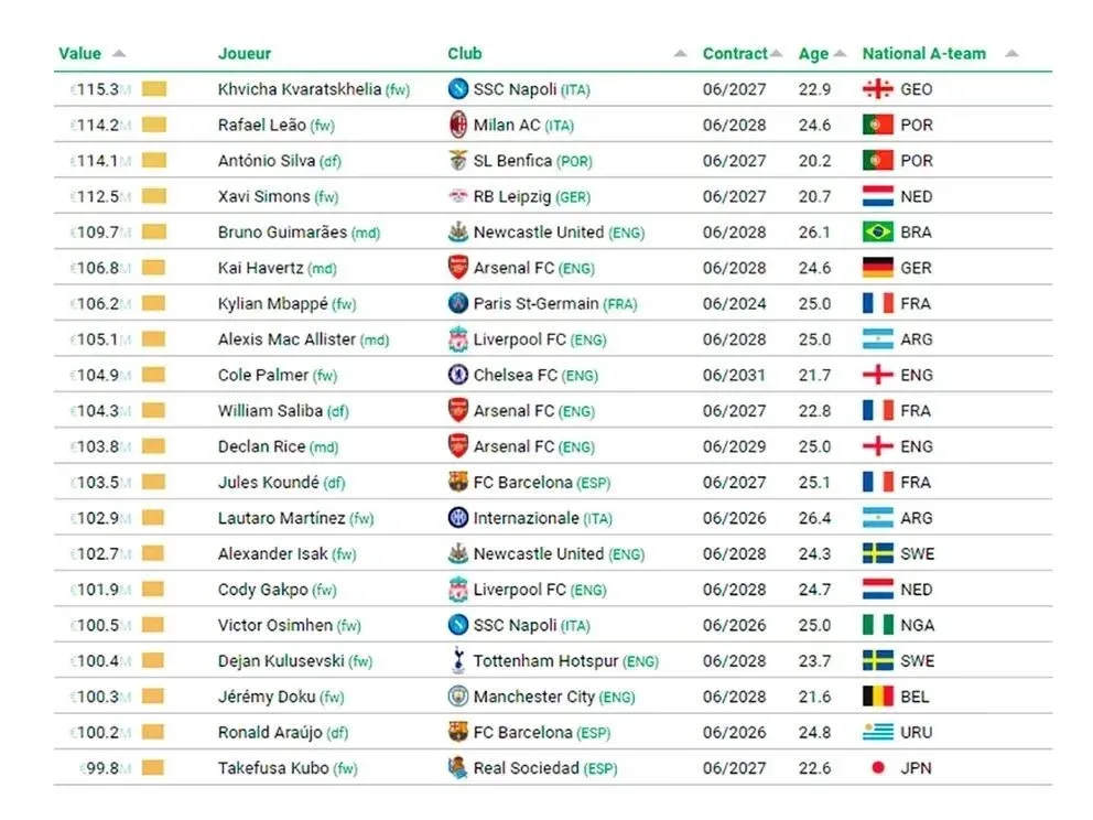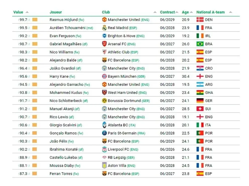 El jugador más joven en la lista es el brasileño Endrick, nuevo fichaje del Real Madrid, con 17 años y cuatro meses. Mientras que el más veterano es Harry Kane, con 30 años y cuatro meses, actualmente en el Bayern Múnich. Por otro lado, Kylian Mbappé, líder de la lista en años anteriores, ha caído al puesto 27° debido a la posibilidad de quedar libre del PSG en junio, lo que ha afectado su valor en el mercado.
