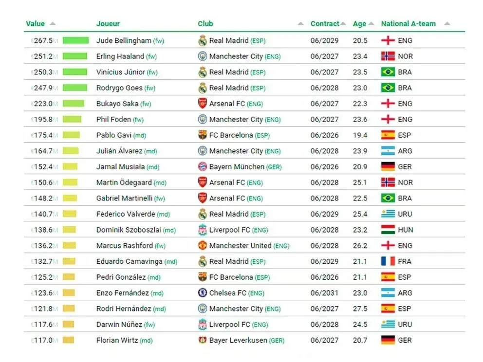 En la primera posición se encuentra el alemán Jude Bellingham, figura del Real Madrid, con un valor de 267,5 millones de euros (USD 292,9 millones) a sus apenas 20 años. Bellingham ha brillado en su primera temporada con el equipo blanco, convirtiéndose en un favorito de la afición. En segundo lugar se ubica el goleador Erling Haaland, con un valor de 251,2 millones de euros (USD 275 millones), consolidándose como una realidad después de liderar la tabla de goleadores del Manchester City la temporada pasada. Cerrando el podio se encuentra Vinícius Jr, valorado en 250,3 millones de euros (USD 274 millones).