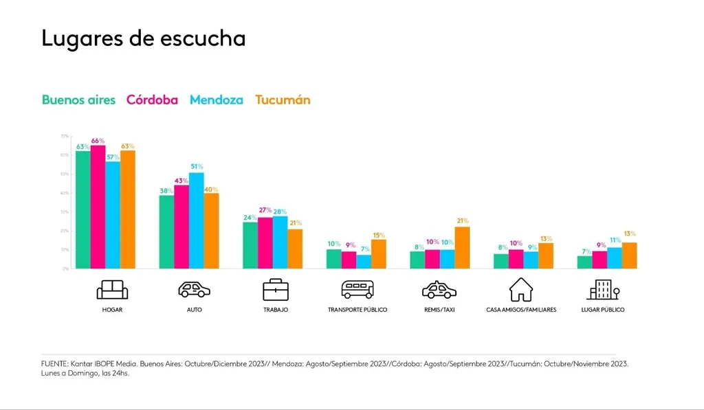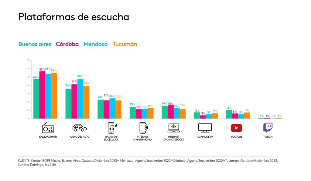 Respecto de la plataforma en la que se escucha, la radio común se mantiene en torno al 50% (en los extremos, 48% en Buenos Aires y 57% en Córdoba), seguida de la radio del auto (36% en Buenos Aires y 48% en Mendoza). A partir de allí, lo que hay es una dispersión de nuevos modos de consumir radio que van desde la radio en el celular, radio por internet (PC/notebook), quienes prefieren escucharla en un canal de TV, YouTube y, en una proporción muy pequeña, Twich.