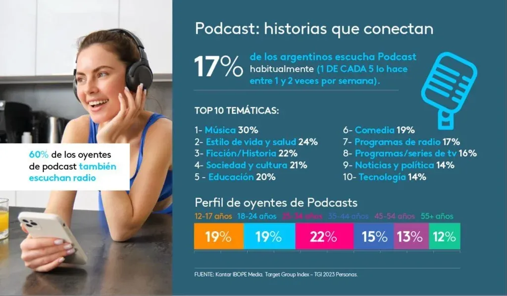 En el mismo barrio, los podcast han ido creciendo hasta alcanzar al 17% de los argentinos, con uno de cada cinco escuchando entre 1 y 2 veces por semana. El 60% de los oyentes de podcast también escuchan radio.