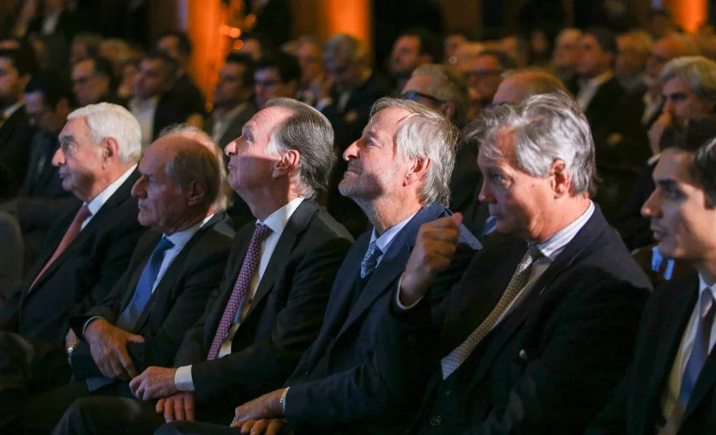 El ministro de Economía, Luis Caputo, se reúne con empresarios en la Bolsa de Comercio, actividad organizada por la Fundación Mediterránea. El vicepresidente de la Sociedad Rural Argentina, Marcos Pereda, y el empresario Cristiano Rattazzi durante el evento.