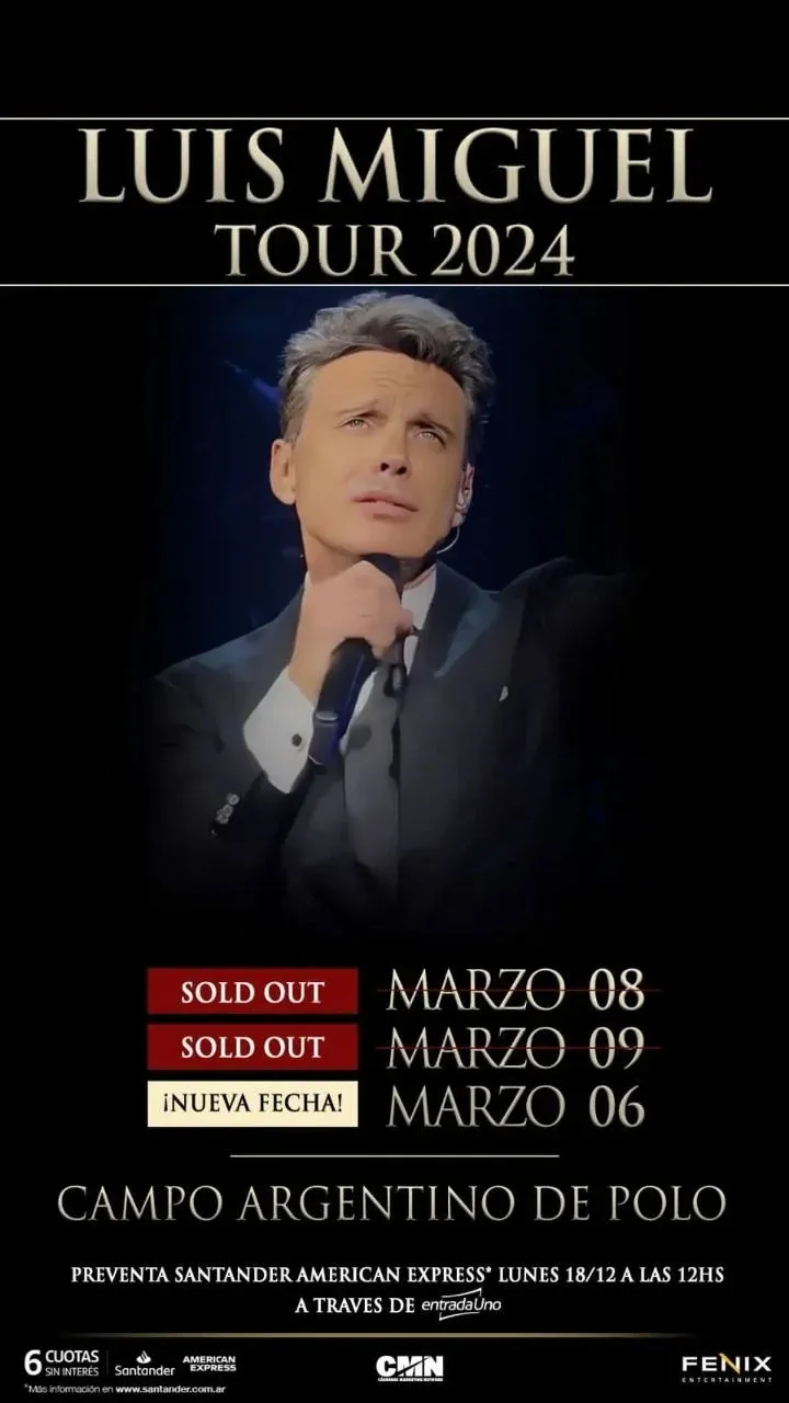Luis Miguel visitará la Argentina en marzo del próximo año, presentándose en el Campo Argentino de Polo. Una fecha adicional ha sido añadida a pedido del público, consolidando aún más su impacto en la escena musical. La cita está programada para el 6 de marzo.