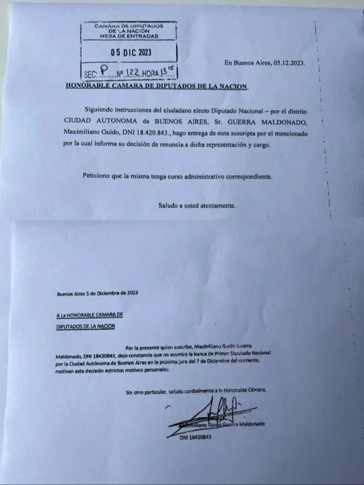 El bailarín Maximiliano Guerra, quien obtuvo un escaño en la Cámara de Diputados al integrar la lista de Patricia Bullrich en las recientes elecciones presidenciales, ha presentado su renuncia al cargo programado para asumir el 10 de diciembre. La dimisión fue presentada ante la mesa de entradas del Congreso este martes.