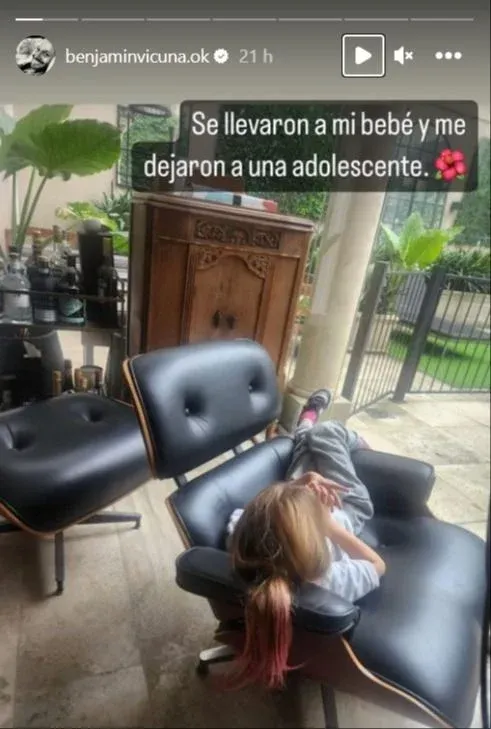 En una de las fotos, Benjamín compartió un selfie con Magnolia y el fondo lleno de flores, incluida la magnolia, que curiosamente es el nombre de su primera hija con Eugenia. En otra imagen, la niña aparece cómoda en el sillón con su uniforme escolar y las mechas rosas. Sorprendido por el nuevo look, Benjamín reflexionó sobre lo rápido que crecen sus hijos, comentando: "Se llevaron a mi bebé y me dejaron a una adolescente".