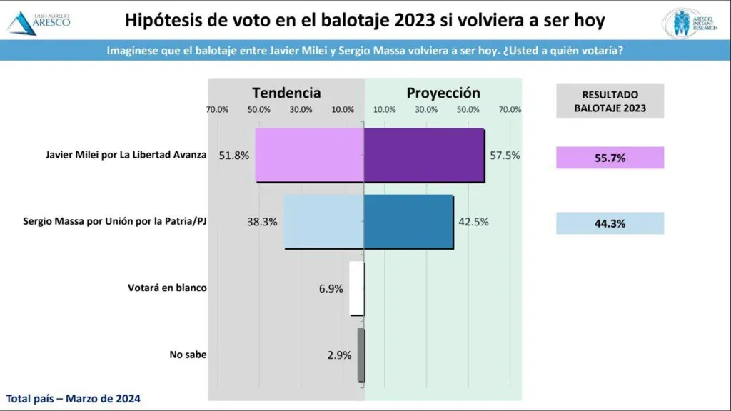 En el escritorio del presidente hay un estudio de simulación de la consultora Aresco. Estima que, si la segunda vuelta se hubiera celebrado hoy, Milei habría ganado ya no con el 56, sino con casi el 58% de los votos.