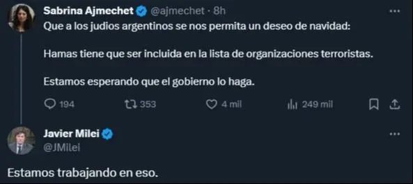 “Estamos trabajando en eso”, aseguró el presidente Javier Milei en respuesta a un posteo en redes que realizó la diputada de Juntos por el Cambio, Sabrina Ajmechet, donde pedía como “deseo de navidad” que la organización islamista ocupe un lugar en ese listado.