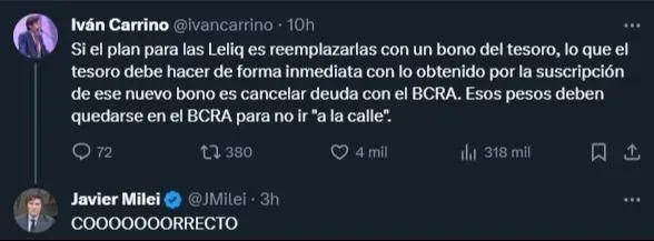 La sugerencia de Carrino, publicada en la mañana de ese sábado, planteaba la posibilidad de "reemplazar las Leliqs con un bono del tesoro". En este contexto, enfatizó que "lo obtenido por la suscripción de ese nuevo bono debe ser destinado de inmediato a cancelar deuda con el BCRA".